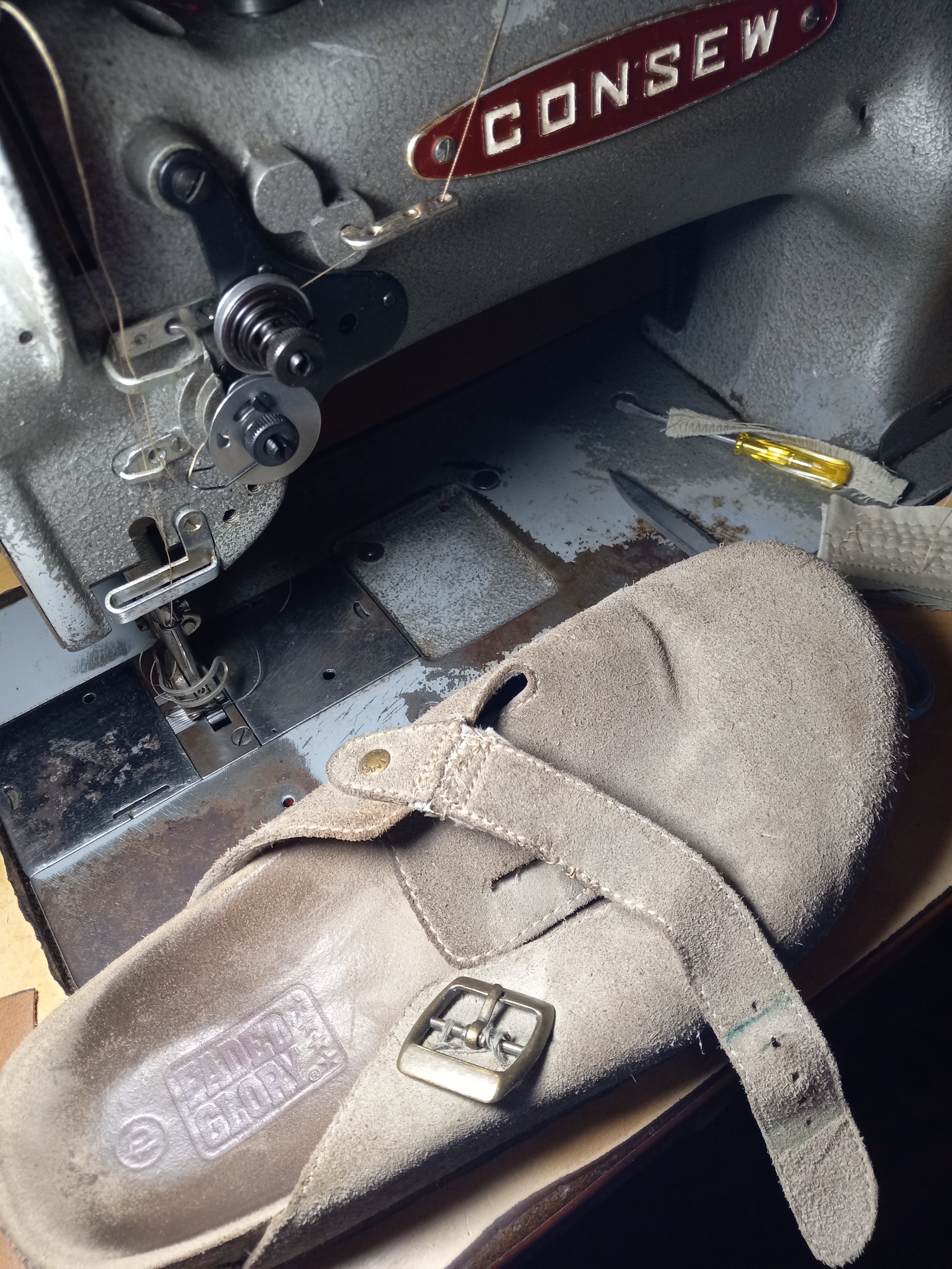 | Faux leather clog after mending repair sewn with Consew 225, to test it, with new tension unit, and servo motor. |